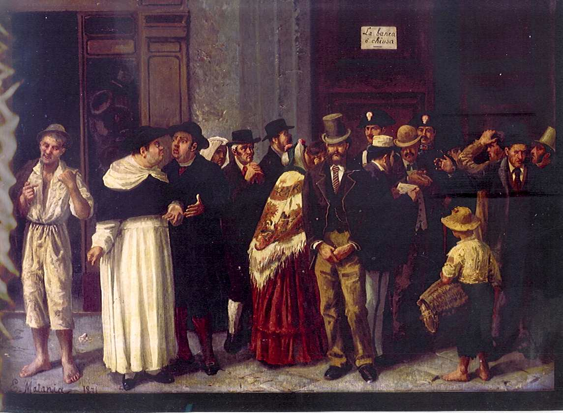 In the “Bancarotta” painting by Matania in 1871 you can see the little sign on the door, just behind the police, that says “La banca e’ chiusa” (the bank is closed).