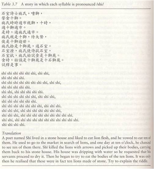 Take a look at this Chinese poem in which each syllable is pronounced as shi. Shī Shì shí shī shǐ 施氏食狮史. “Lion Eating Poet in the Stone Den” is a 92-character poem written in Classical Chinese by Chao Yuen Ren, … Continue reading