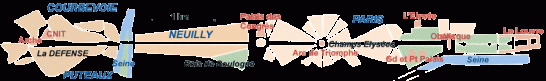 Around this center, the Carrefour du pont de Neuilly, an important crossroads; La Place de la Défense, with the museum of La Défense; the Bassin de Takis offering a remarkable view towards Neuilly, the Historical Axis and the Tour Eiffel. Also, since 2007, a small vineyard called the Clos de Chantecoq, is present.