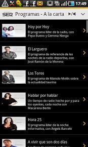 Once you open the app, you will hear the radio en directo (live) and you will see a menu with other options: emisoras: radio stations in different cities / programación: schedule of programs with the time you can listen to them in the U.S. / programas a la carta: menu of available programs / últimas noticias: last news, in print / ayuda: help